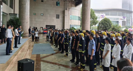 在消防疏散演练中,模拟由一楼设备短路引发的意外起火,应急疏散演练各小组人员立即启动应急预案,随着声光报警系统的警报声响起,全体参演人员在各层安保队员的指挥引导下迅速撤离,分别由办公室所在楼层的2条疏散通道疏散至金鹰大厦前坪。
